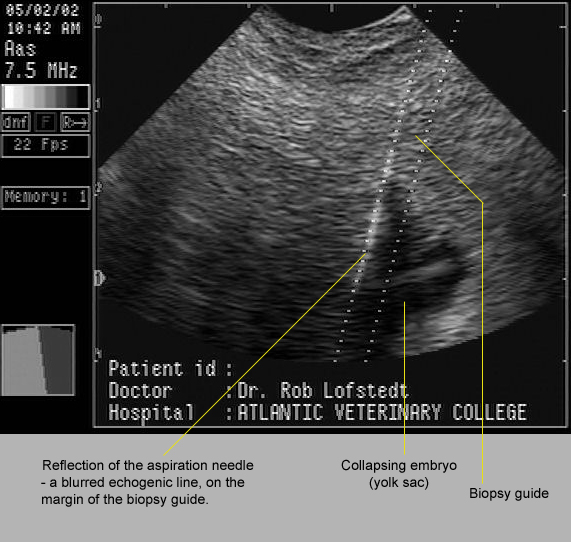 In the image below, 17 day old twins had fixed close to one another within the uterus. One was punctured and drained by ultrasound-guided aspiration through the fornix of the cranial vagina. If one has access to the correct equipment, this is a straightforward procedure.